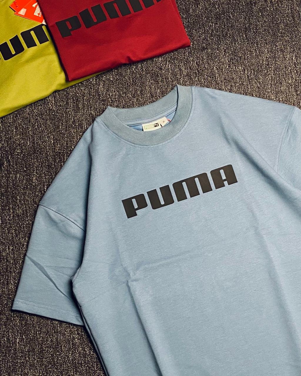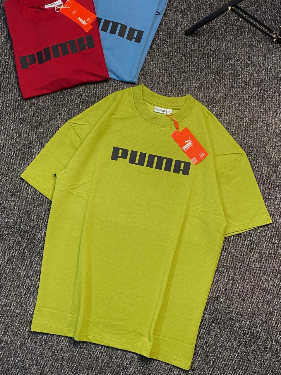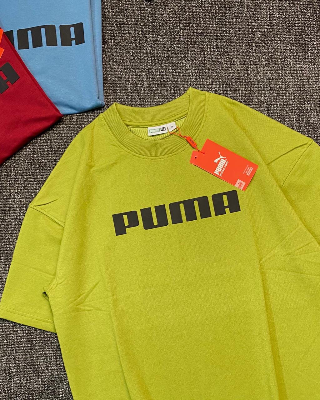 Brand: PUMA Design: Bold front PUMA logo print Fit: Relaxed / Oversized fit Neck: Classic round neck (crew neck) Sleeves: Half sleeve Fabric: Soft and breathable cotton fabric (comfortable for daily wear)